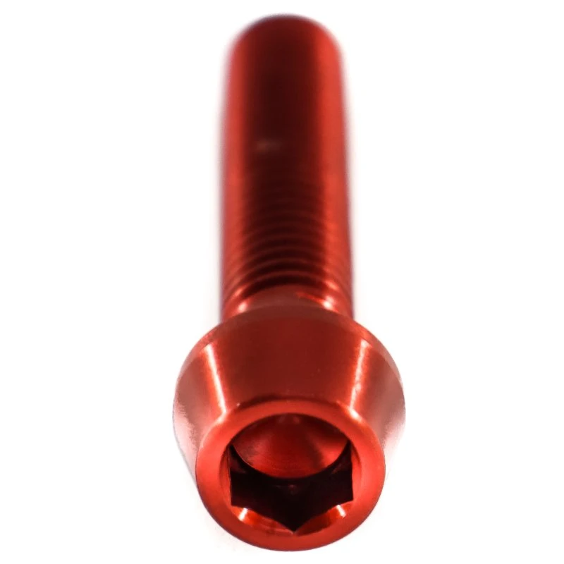 Mit Hilfe dieser optisch ansprechenden und gleichzeitig sehr leichten Aluminiumschrauben lässt sich das Gewicht deines Bikes auf effektive Art reduzieren. Durch Auswahl einer perfekt passenden Farbe können herausragende Akzente gesetzt werden, die dein Bike zu etwas ganz Besonderem machen. Diese rot eloxierten und extrem belastbaren Schrauben werden aus hochwertigem 7075 Aluminium exklusiv in Deutschland von der Firma Jäger Motorsport hergestellt. Zur sicheren Übertragung des Anzugsdrehmoments verfügen sie über einen präzise gearbeiteten und sehr haltbaren Innensechskant. Aufgrund ihres konisch zulaufenden Kopfes können diese in unterschiedlichen Farben, Durchmessern und Längen erhältlichen Schrauben auch an zum Teil schwer zugänglichen Positionen verwendet werden, wodurch sie sich für eine Vielzahl von Anwendungen empfehlen. Trotz ihrer hohen Zugfestigkeit und Haltbarkeit sollte von einer Verwendung dieser Schrauben in sicherheitsrelevanten Bereichen wie Vorbauten und Bremsen dringend abgesehen werden.