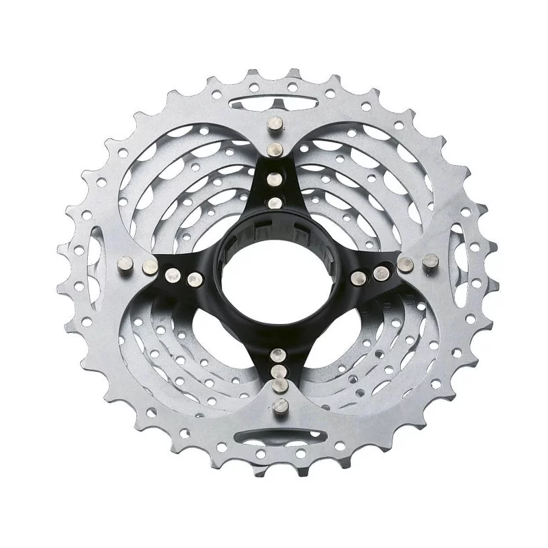 Über viele Jahre hinweg war der 9-fach Antrieb im Bereich von MTBs und Trekkingbikes quasi ein unumstrittener Standard und auch heute noch vertrauen viele Biker auf die ausgereiften Eigenschaften dieses zuverlässigen und langlebigen Antriebs. Insbesondere die Komponenten aus der XT-Reihe von Shimano genießen bei Bikern auf der ganzen Welt einen exzellenten Ruf und die XT CS-M770, 9-fach Kassette reiht sich nahtlos in diese Tradition ein. Die Basis der leichten und dennoch sehr robusten und steifen XT CS-M770 Kassette bildet ein Spider aus Aluminium, auf dem die fünf größten Ritzel aufgenietet sind, während die restlichen Ritzel lose auf den Freilaufkörper geschoben und mit dem Abschlussring aus Aluminium gesichert werden. Alle Ritzel verfügen über computerberechnete Steighilfen im Shimano HG-Design und sorgen auf diese Art für jederzeit und unter allen Bedingungen butterweiche und sehr präzise Gangwechsel. Beste Ergebnisse in Bezug auf Schaltperformance und Haltbarkeit werden im Zusammenspiel mit den auf diese Kassetten abgestimmten HG-Ketten von Shimano erzielt. Die gestrahlten und verchromten Oberflächen der Zahnkränze verleihen der XT CS-M770 eine sehr edle Optik und werten jedes Bike spürbar auf.